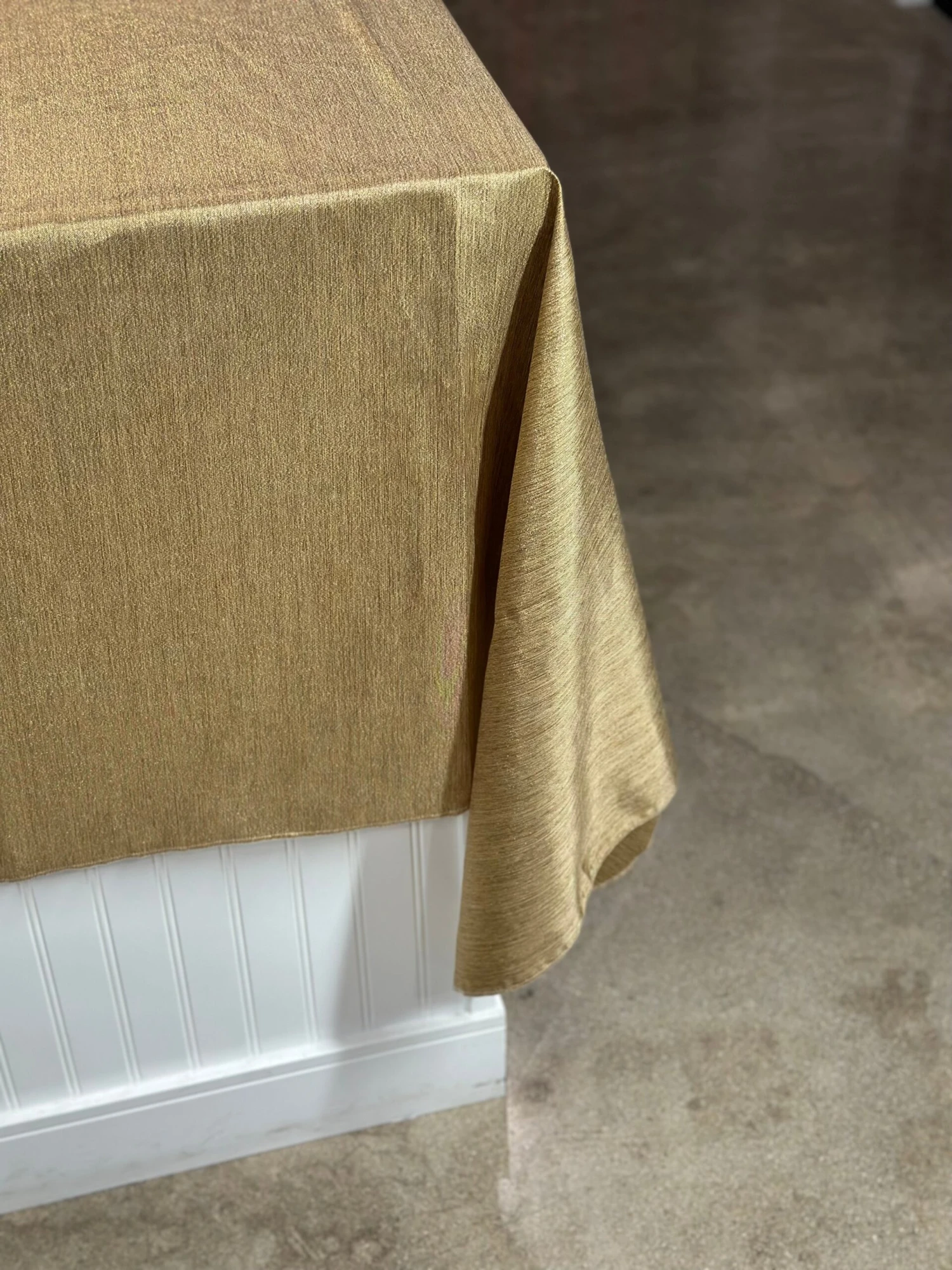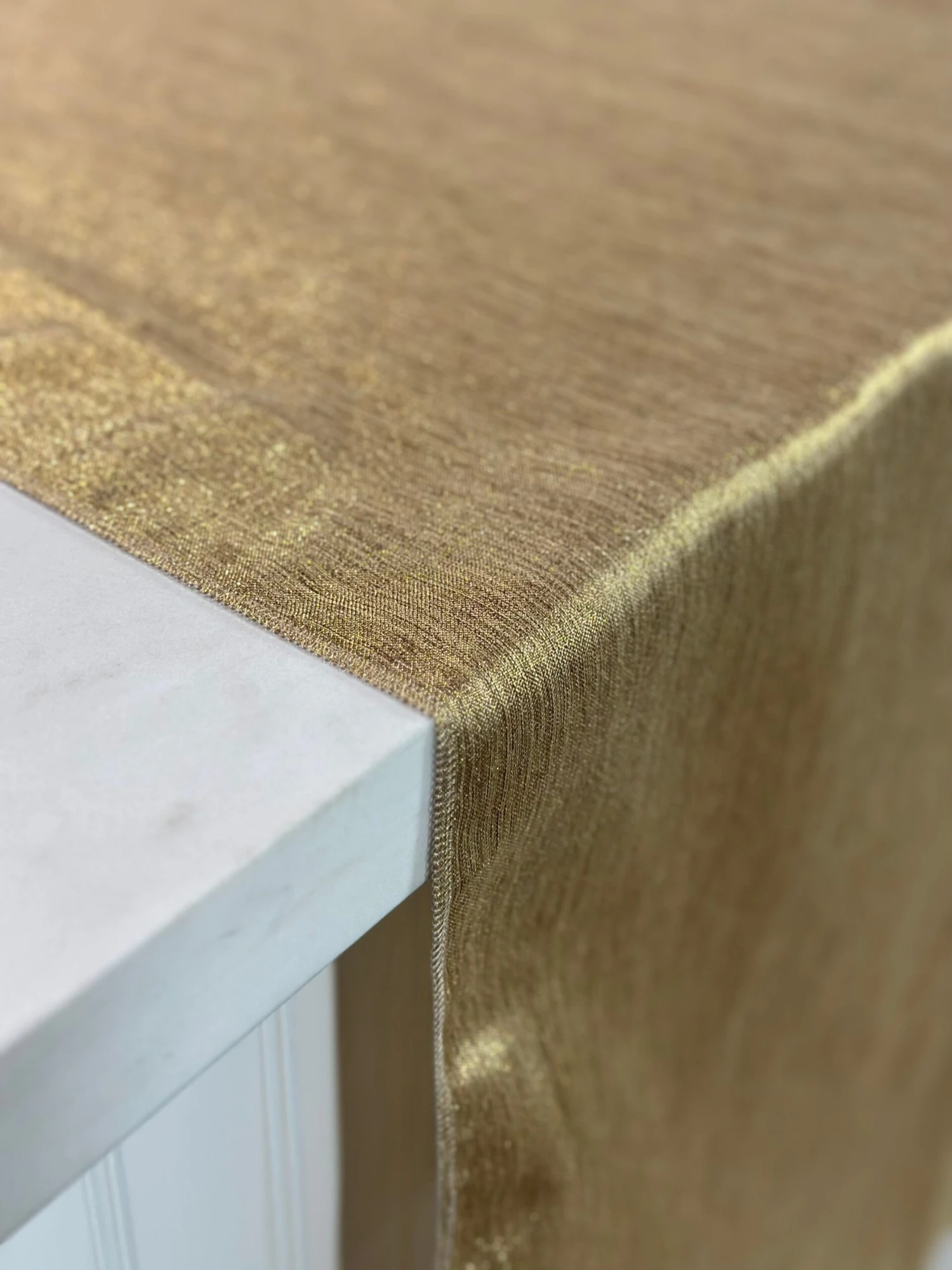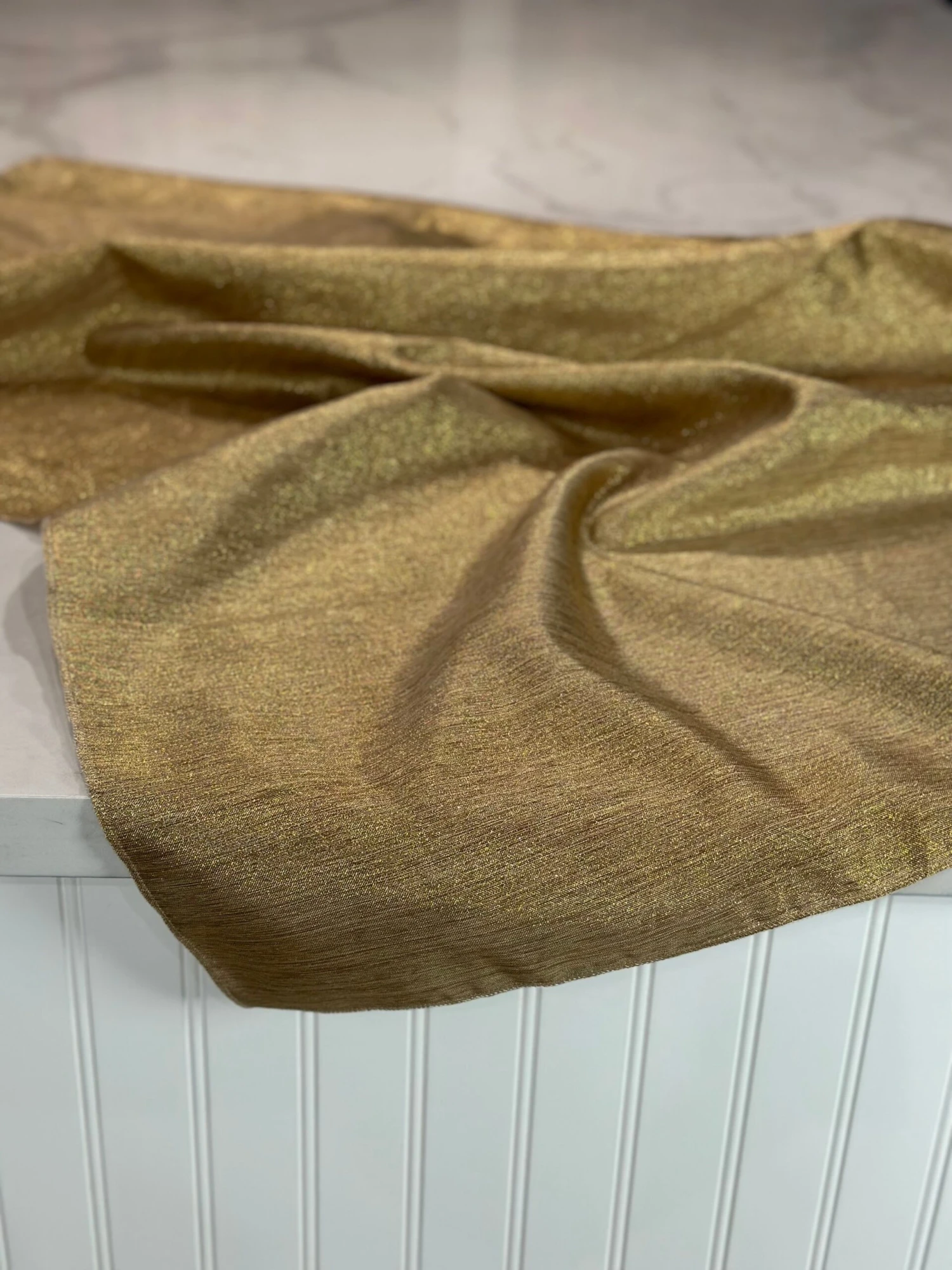 Fabric Collection: This fabric has a burlap texture/design throughout and is made from polyester so it’s easy to care for. It also has metallic threading to give it an elegant upgrade vs the traditional burlap look – This fabric is in an Antique Gold color with Gold metallic threading mixed in.