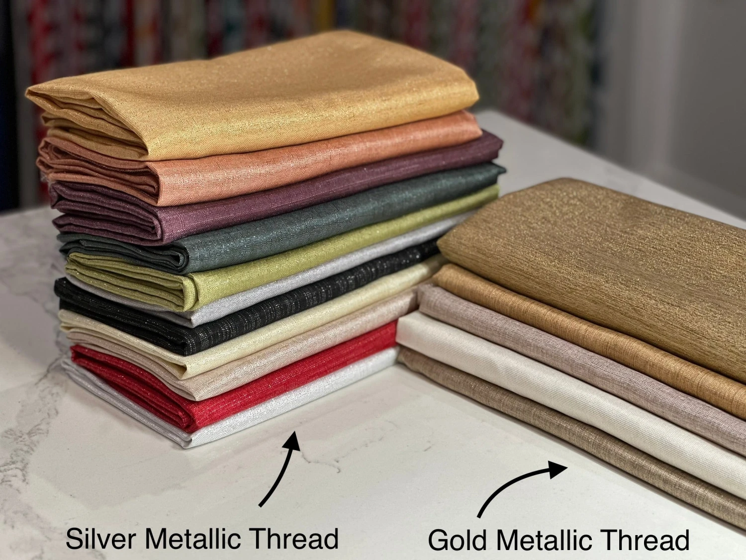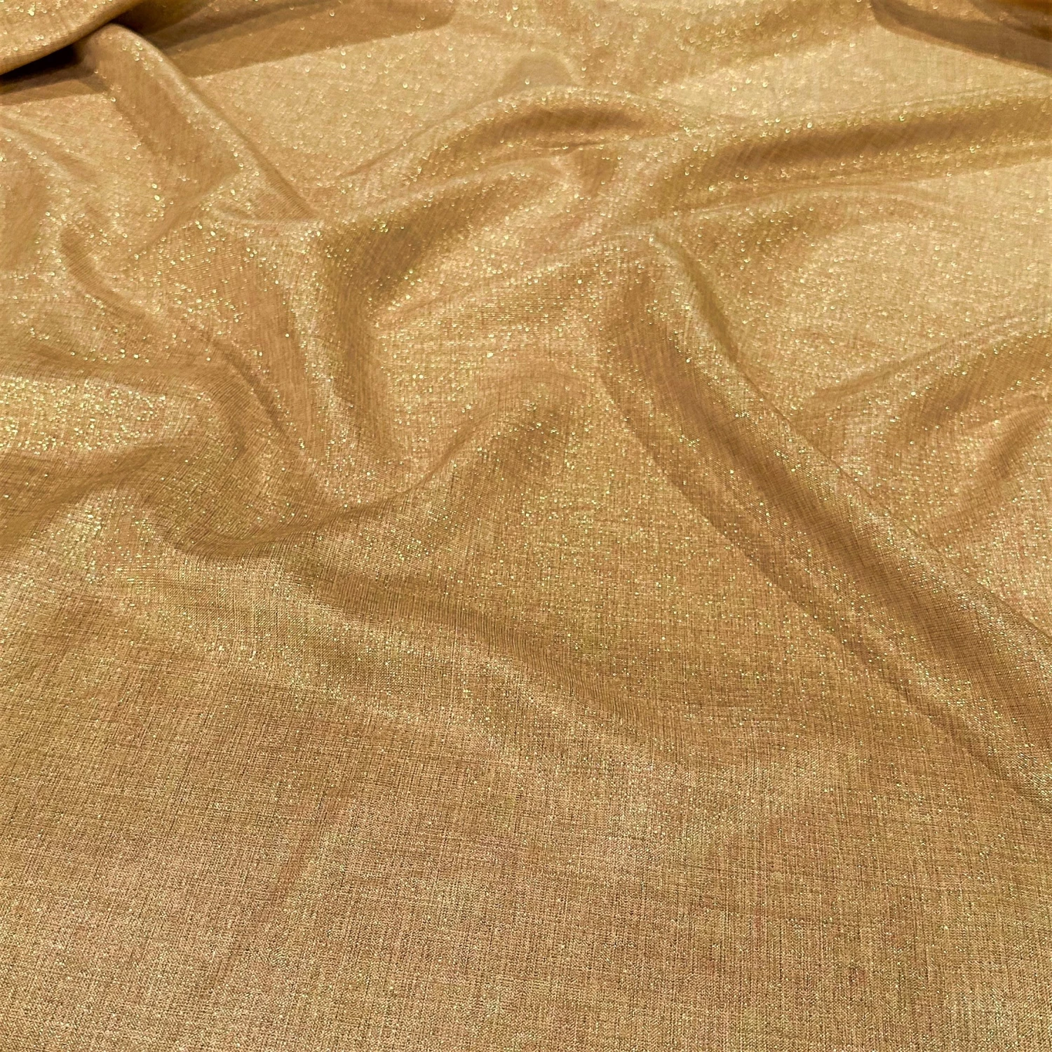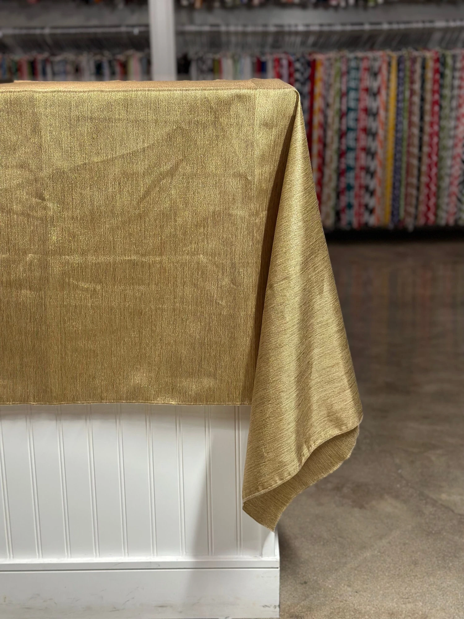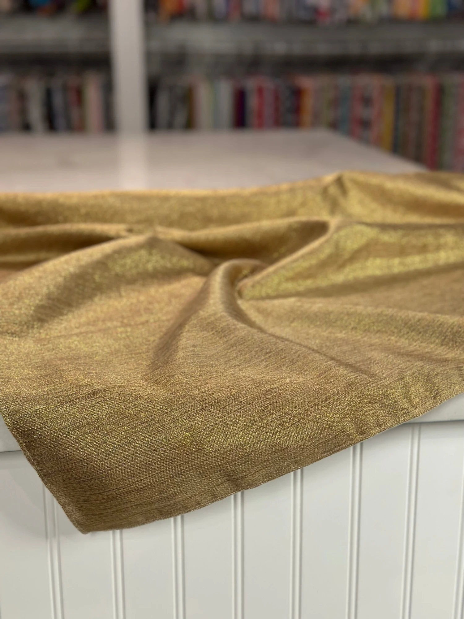 Fabric Collection: This fabric has a burlap texture/design throughout and is made from polyester so it’s easy to care for. It also has metallic threading to give it an elegant upgrade vs the traditional burlap look – This fabric is in an Antique Gold color with Gold metallic threading mixed in.