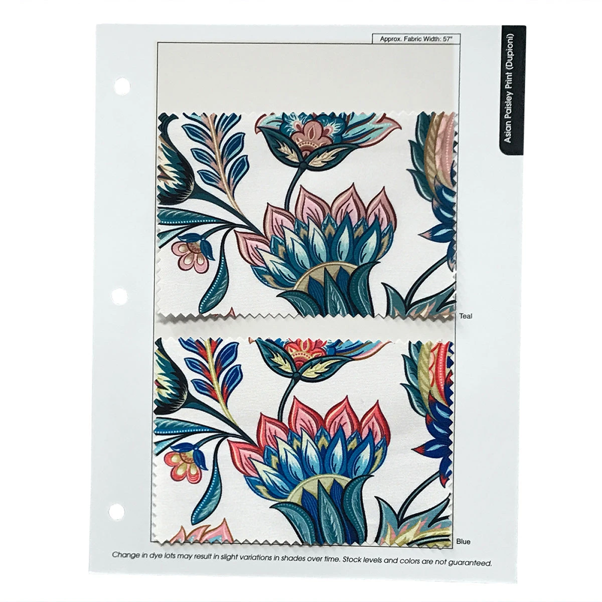 Fabric Collection: This fabric has a 100% polyester base with a Dupioni finish and an Asian Paisley print throughout.