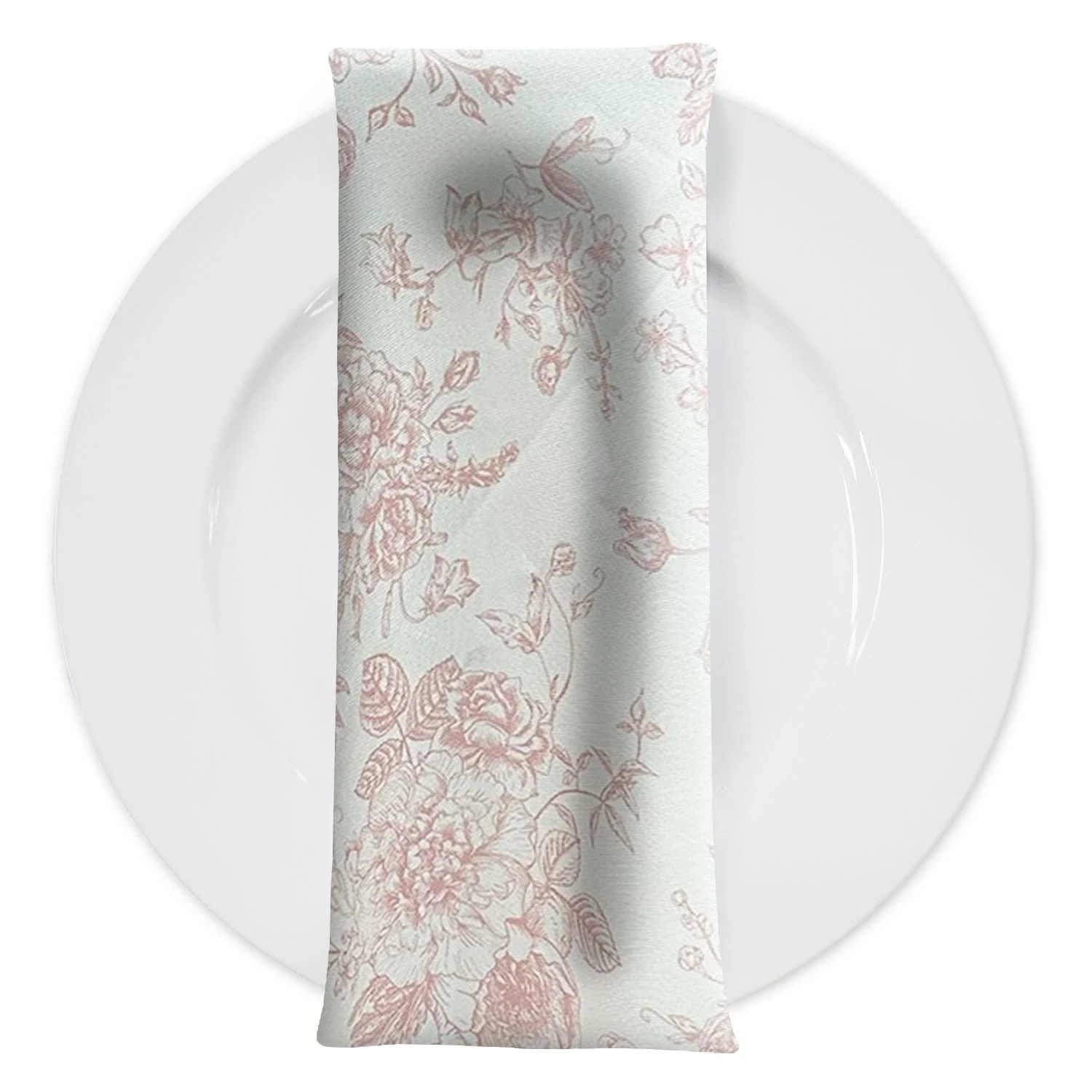 Fabric Collection: This fabric has a polyester base with our “French Toile” print in Dusty Rose color and on a White background.
