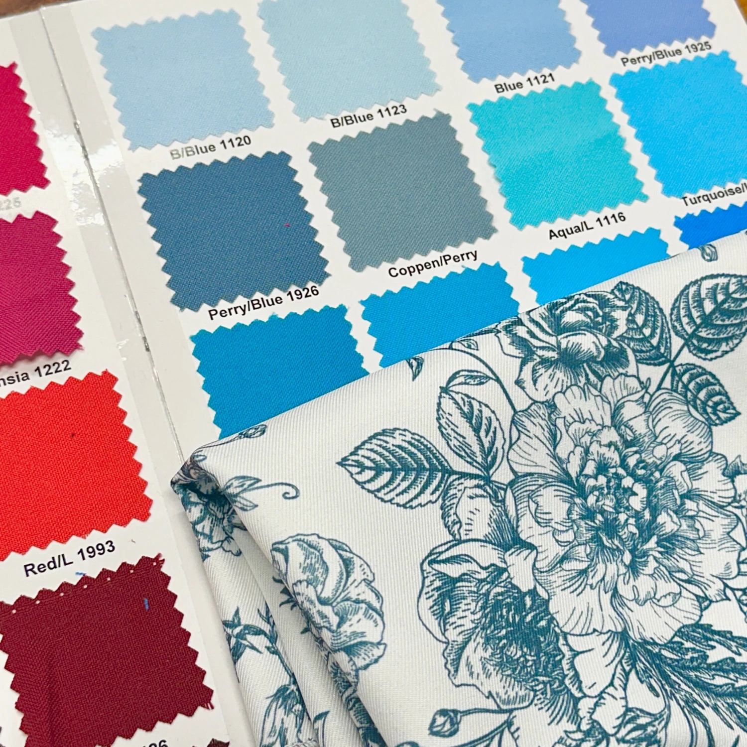 Fabric Collection: This fabric has a polyester base with our “French Toile” print in Copen Perry color with a White background.