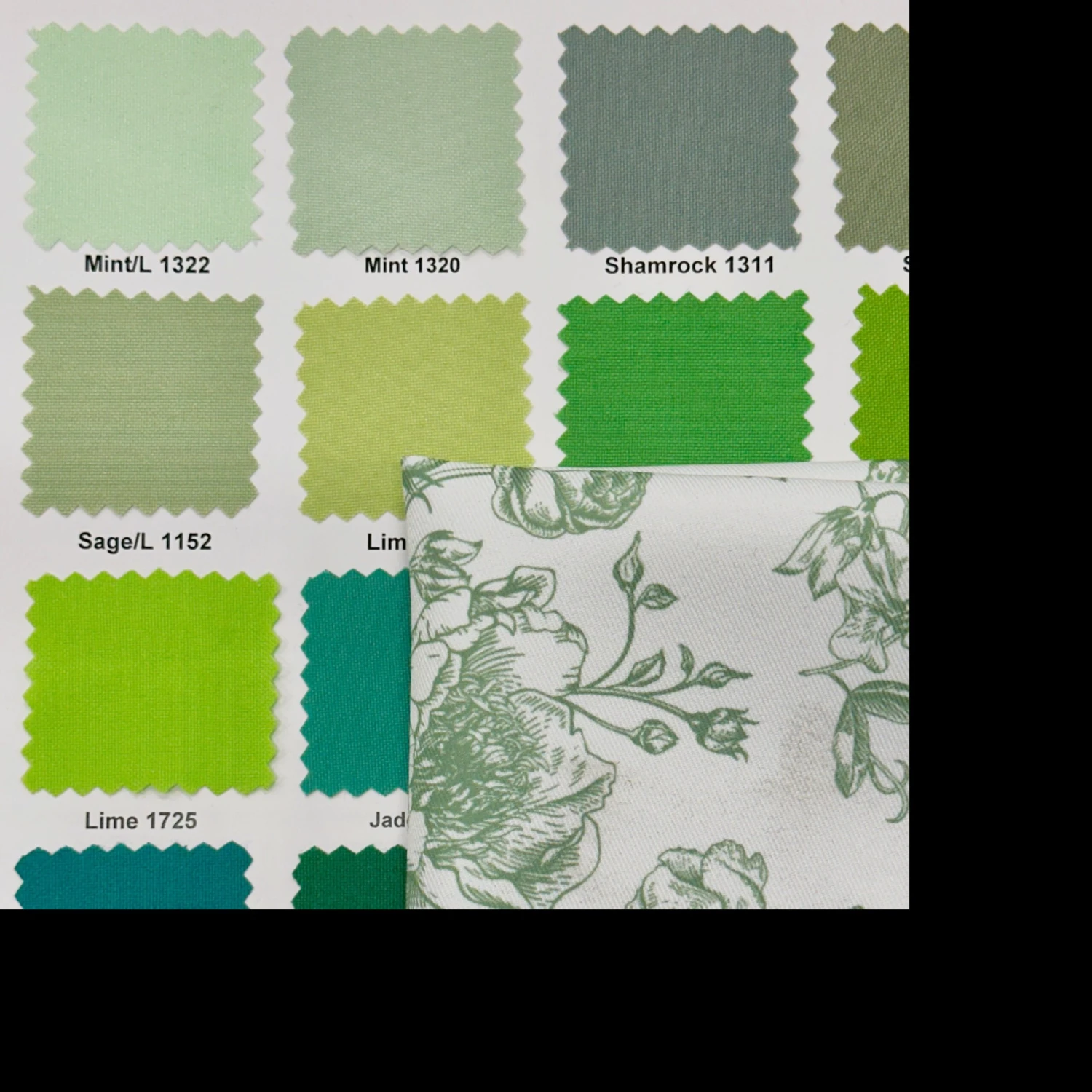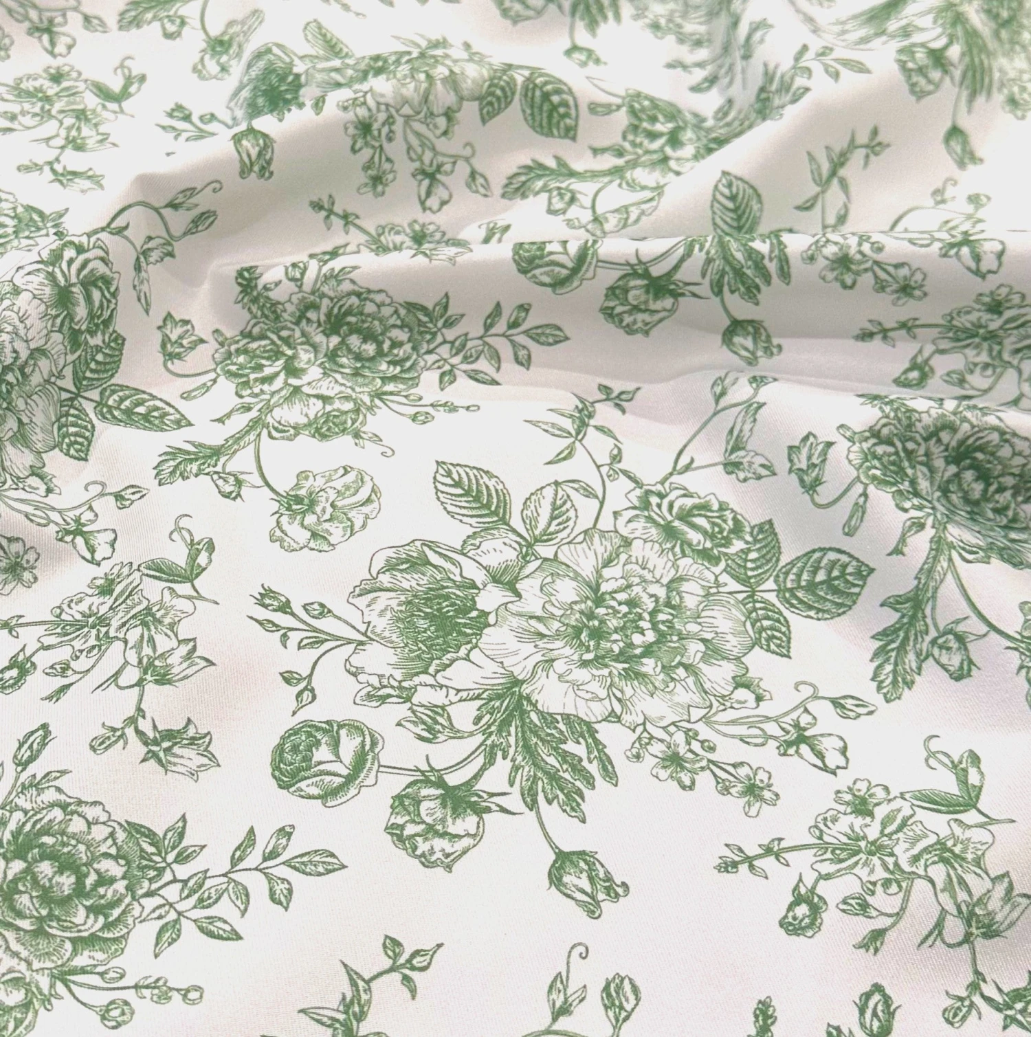 Fabric Collection: This fabric has a polyester base with our “French Toile” print in our Willow Green color with a White background.