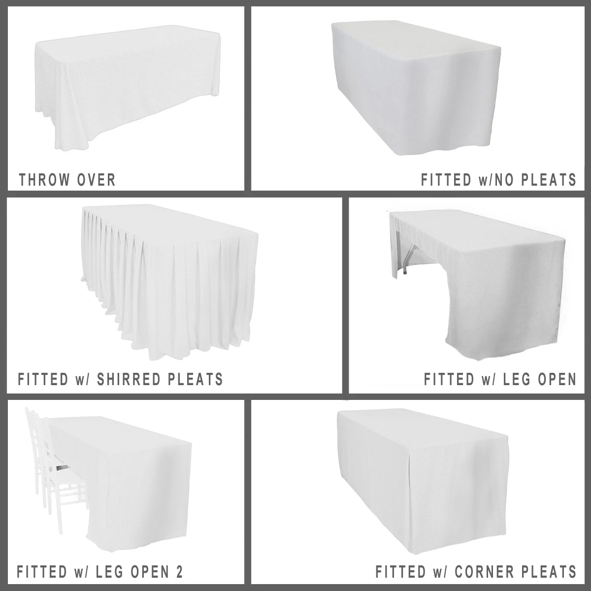 ORDERING INSTRUCTIONS: Step 1: Choose your table type/size. > Step 2: Choose your Linen Fit style. > Step 3: Select Qty and Color. > Step 4: Add to cart and proceed to checkout.