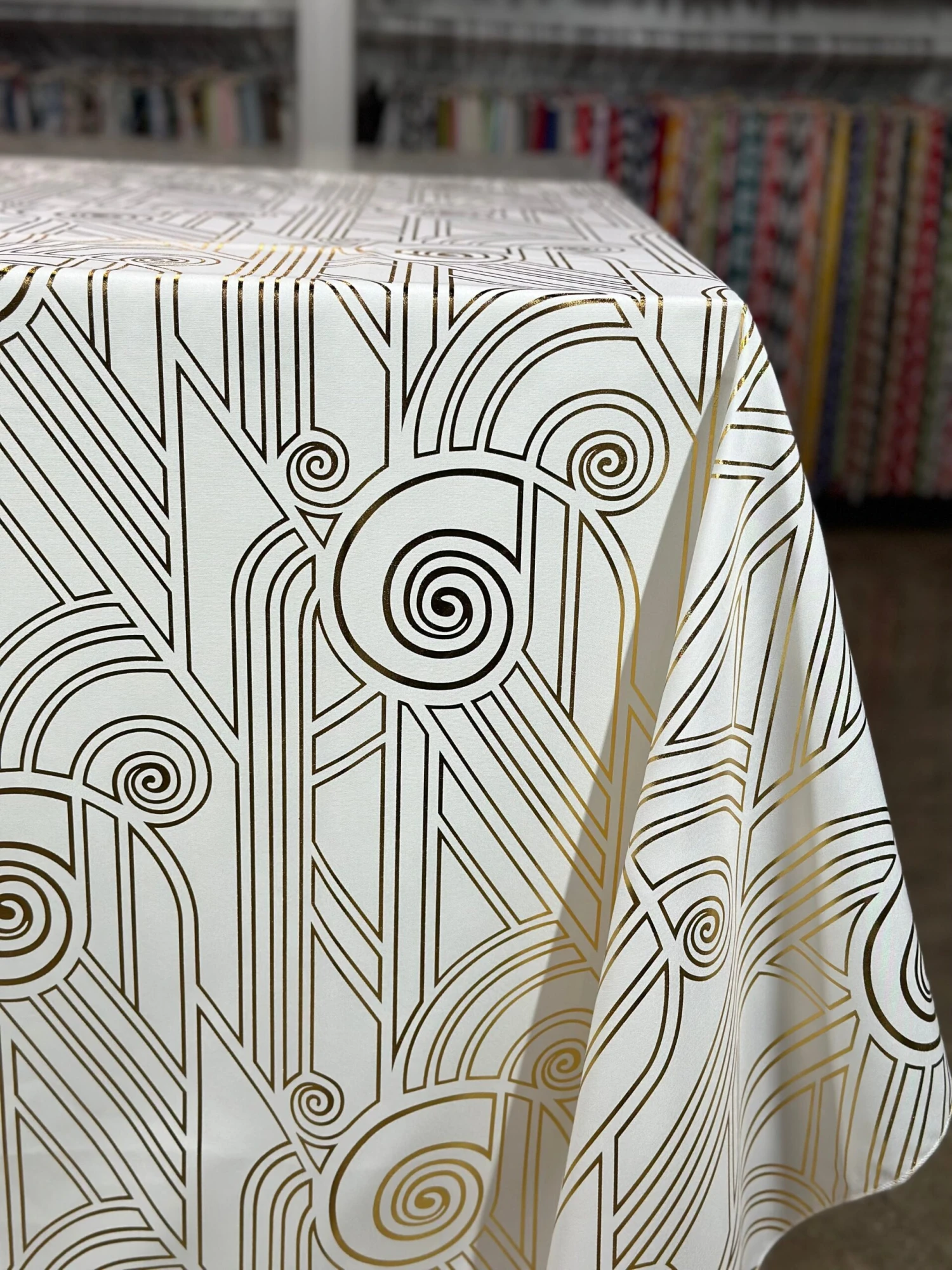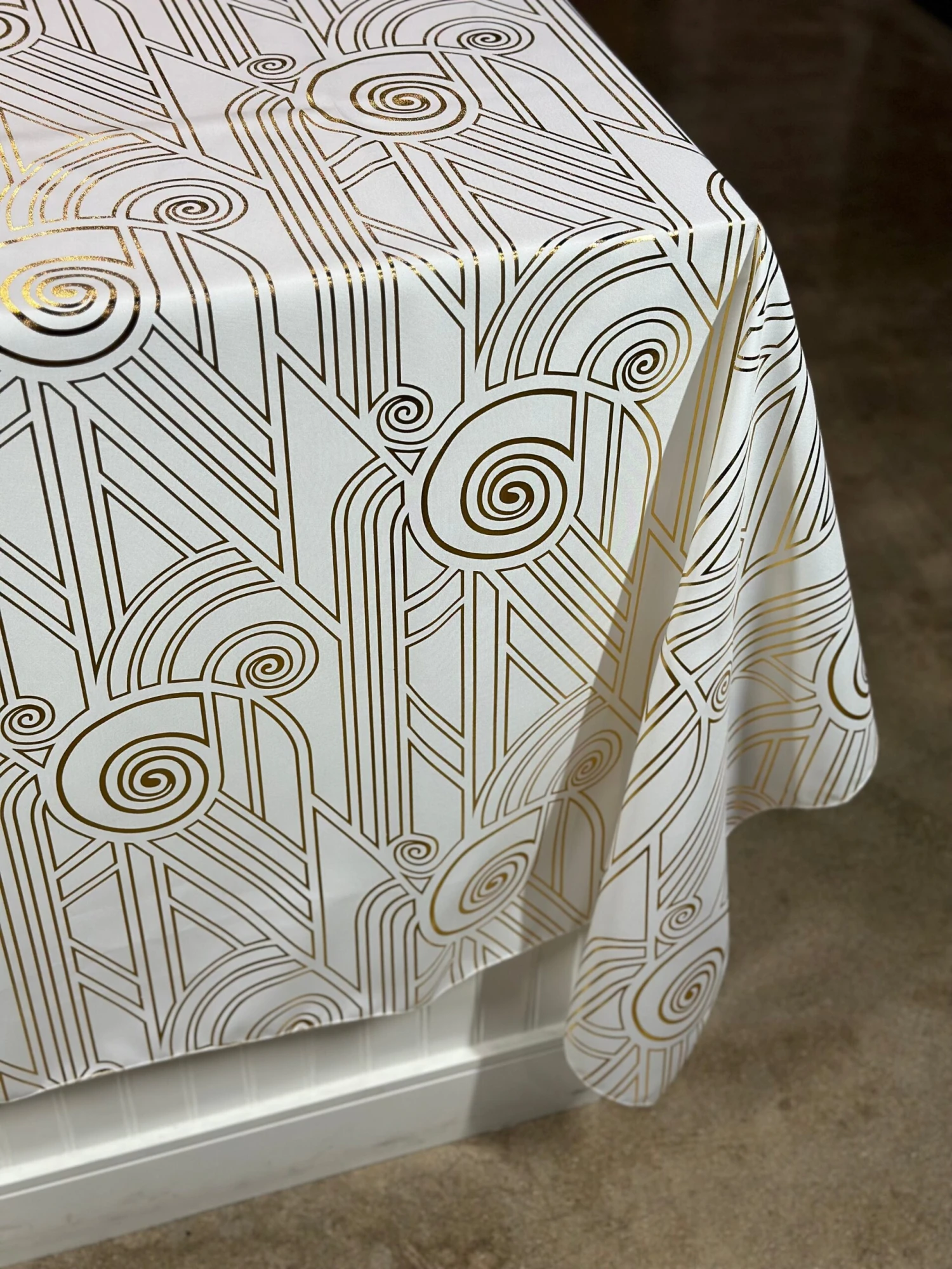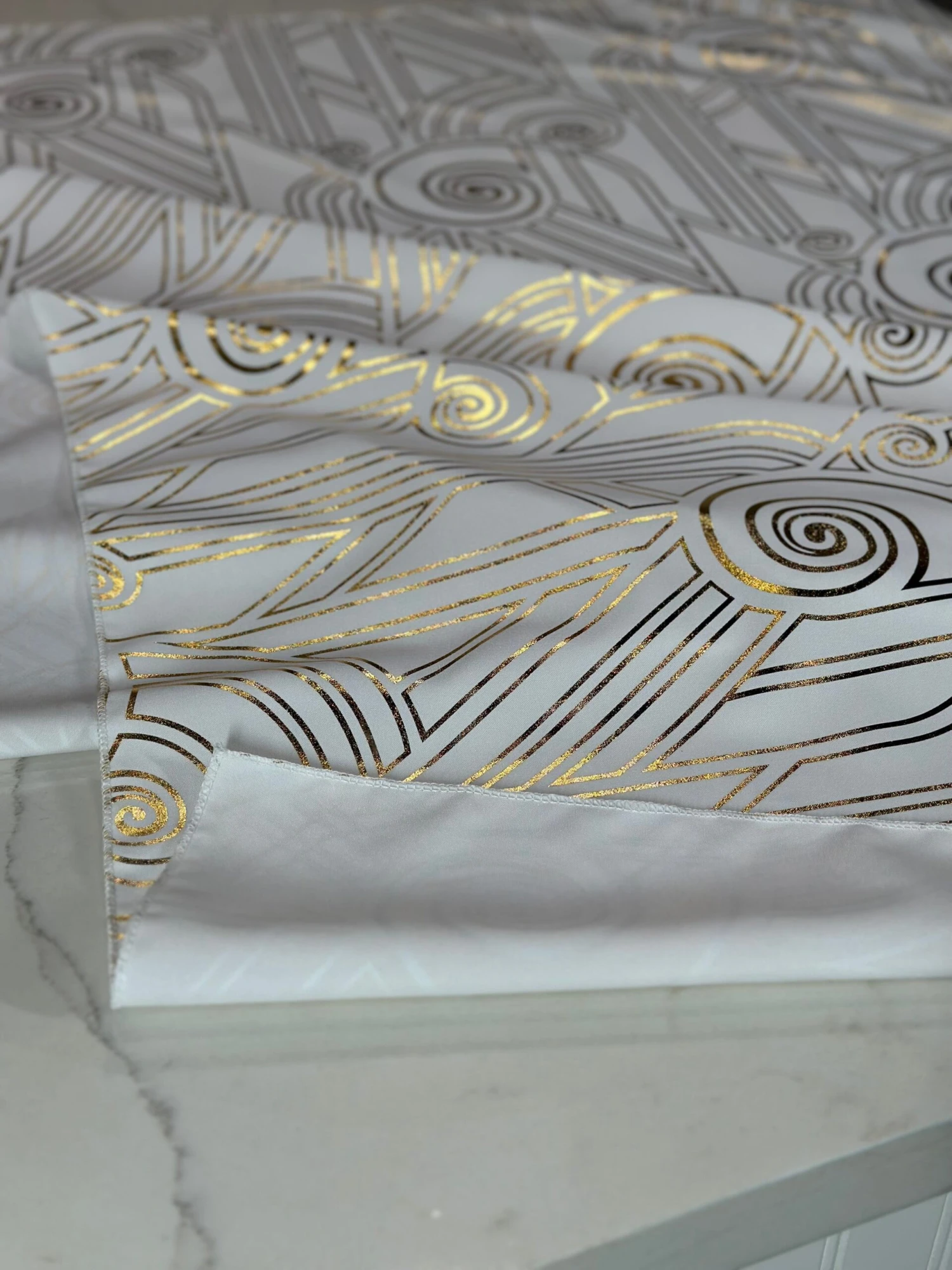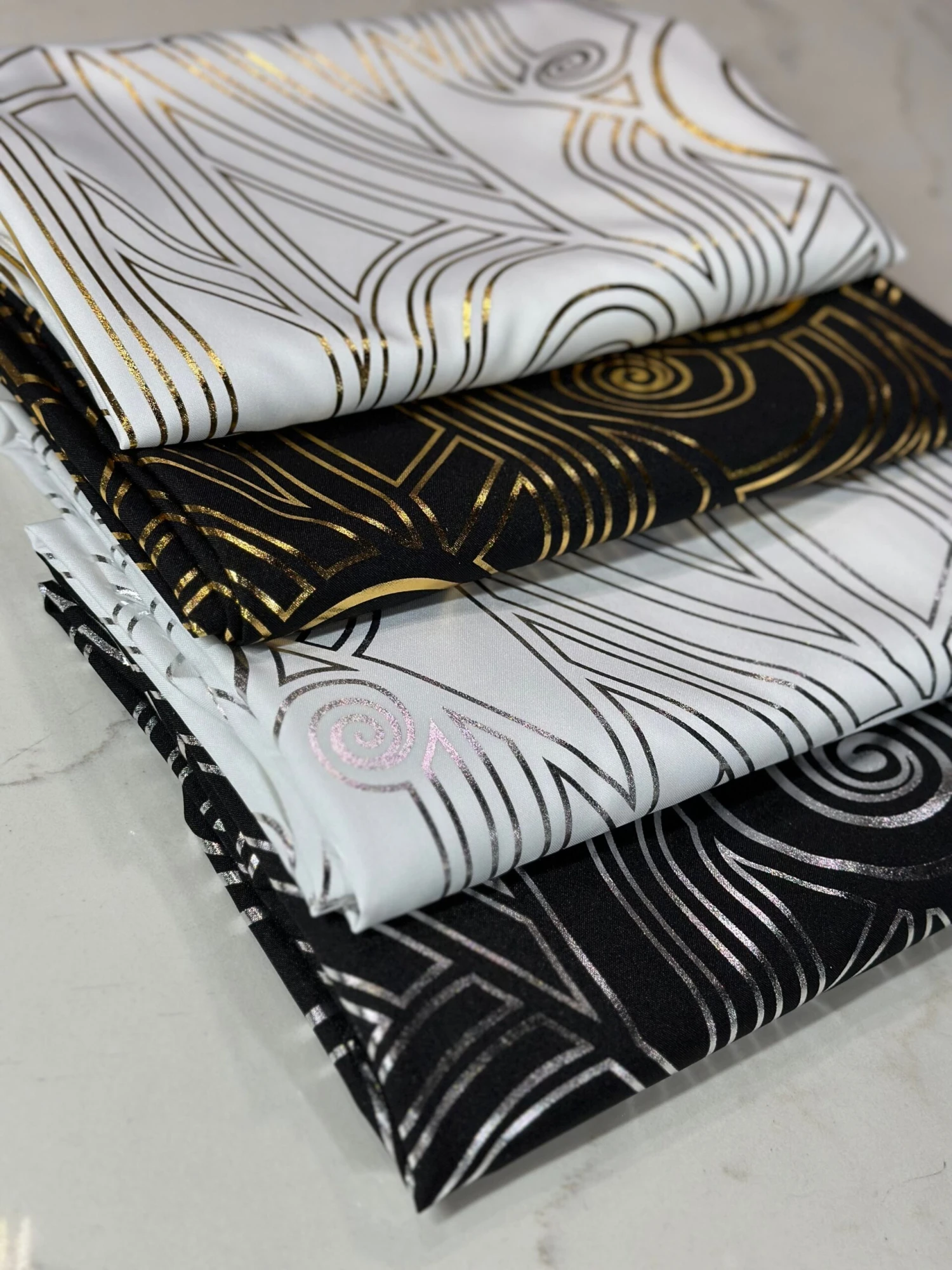 Fabric Collection: This fabric has a Polyester base with our metallic “Luxor” print throughout.