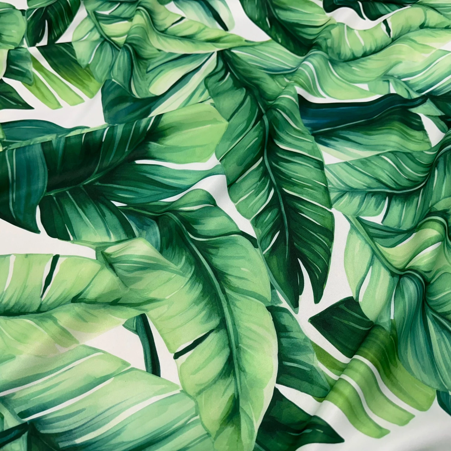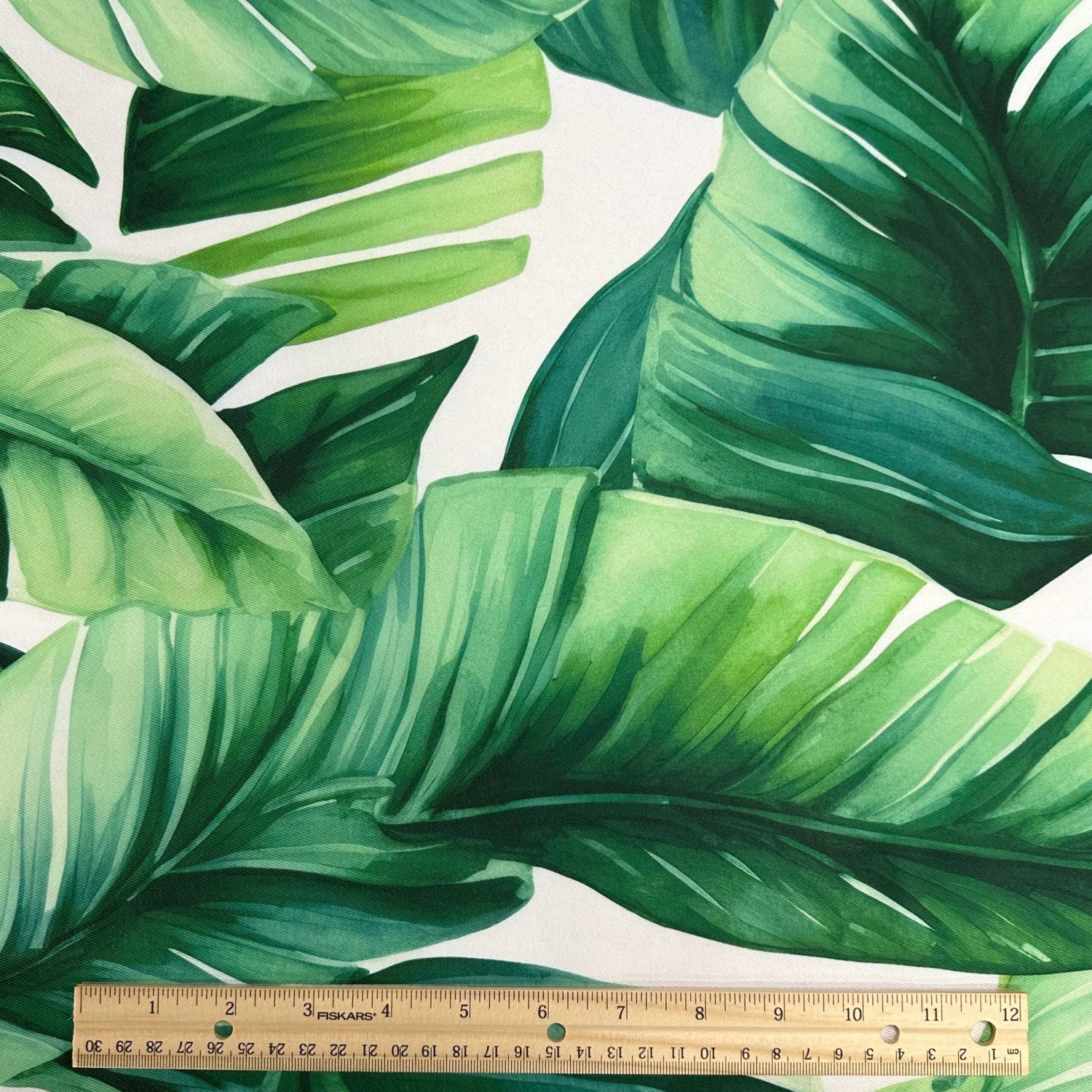 Fabric Collection: This fabric is 100% polyester base with our “Beverly” palm leaves throughout the fabric with a white background.