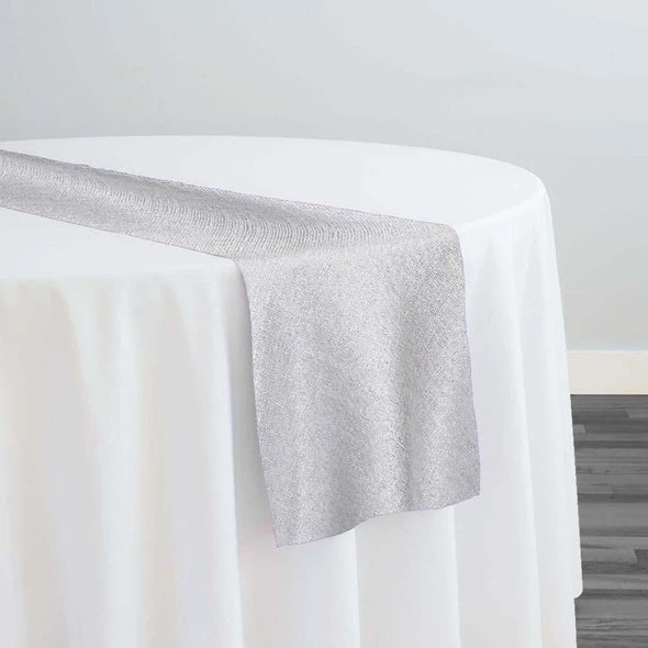 Fabric Collection: This fabric has a burlap texture/design throughout and is made from polyester so it’s easy to care for. It also has metallic threading to give it an elegant upgrade vs the traditional burlap look – This fabric is in a silver color with silver metallic threading mixed in.