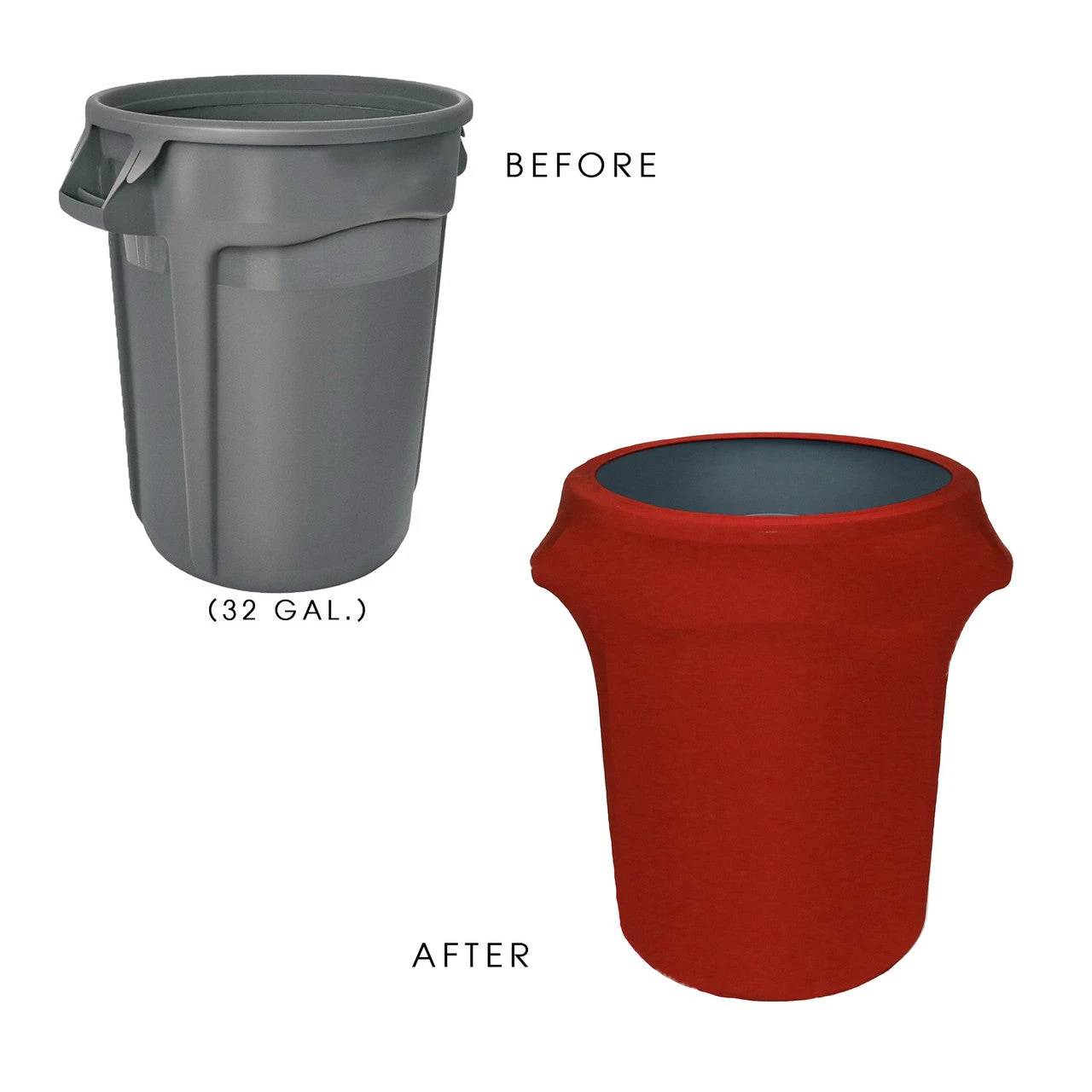 Spandex Trash Can Covers offer a great way to transform old and worn trash cans by providing an elegant and clean look. They’re easy to put-on/take-off and are made from our durable spandex material. They fit standard 32-gallon trash cans and are perfect for special event, conference centers, tradeshows, concerts, and many other functions.